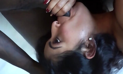 Cute dark skinned babe with amazing boobs is a deep-throater for black hard-on