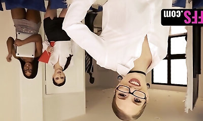 Two pretty office workers Bluelah and Jess Harrington are frolicking with their manager's cock in a hot CFNM
