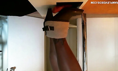 Sensual teasing close up legs and feet in Shiny glossy tights and high heels.