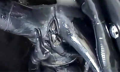 Woman With Big Boobs Encased In Dark-hued Rubber Latex Catsuit Enjoys Bucket Of Hot Cumm - Part 2