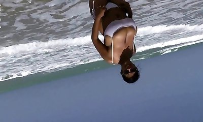 Fit brunette is having interracial sex on the beach with a handsome, ebony guy she luvs