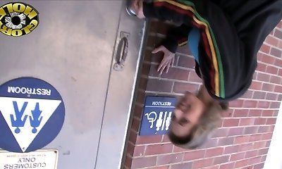 She goes to a gloryhole where she gargles and fucks a black salami